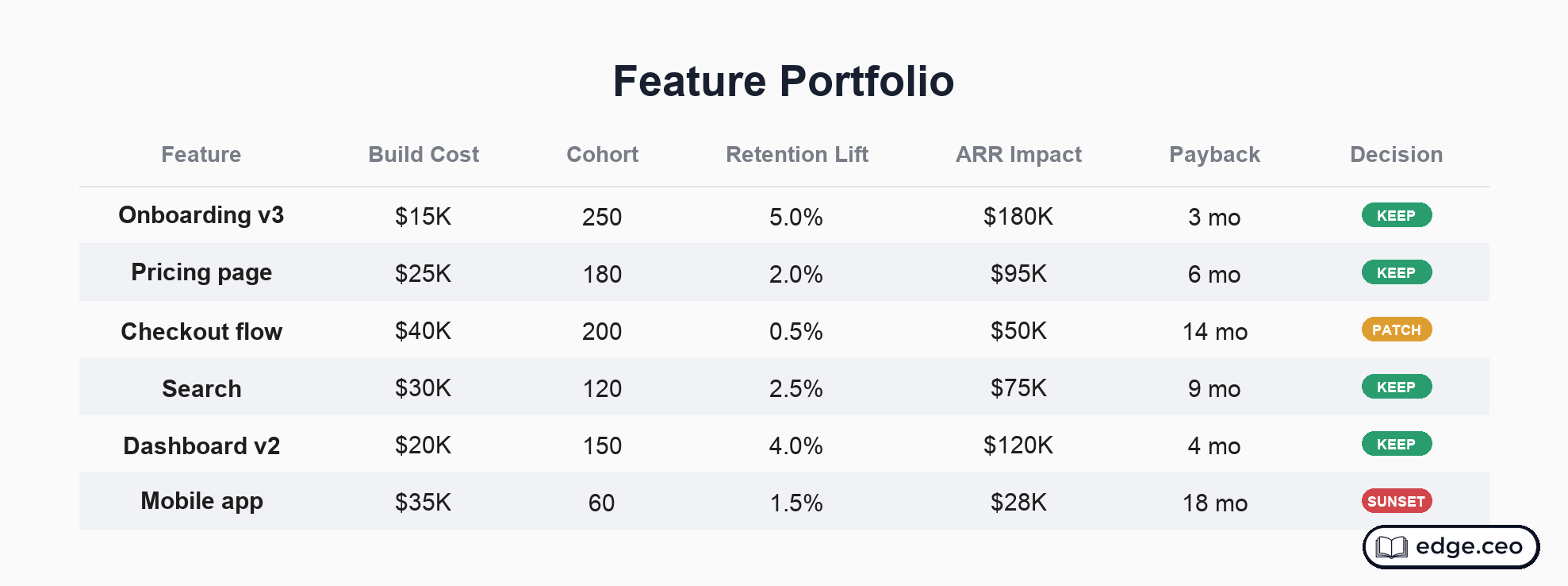 The payback period is sharp enough to decide against. Features that hit their payback stay, and features that miss get patched, repositioned, or sunset. Winners compound their lifetime value across every customer that touches them. Losers return zero.