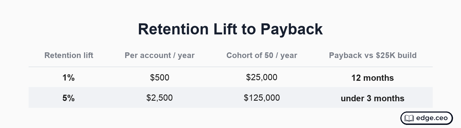 The build cost is the CAC analogue, running $25,000 for a full module and less for smaller features. The expected return is the LTV analogue: a retention lift on a $50,000 account, multiplied across a cohort.